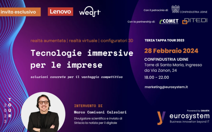 DITEDI patrocina l’iniziativa organizzata da Gruppo Eurosystem ti invita a partecipare all’evento esclusivo in ambito Immersive Technologies in Confindustria Udine in collaborazione con i vendor tecnologici Lenovo e Weart. Grazie alla presenza di Marco Camisani Calzolari, divulgatore scientifico e inviato di Striscia la notizia per il digitale, si parlerà di