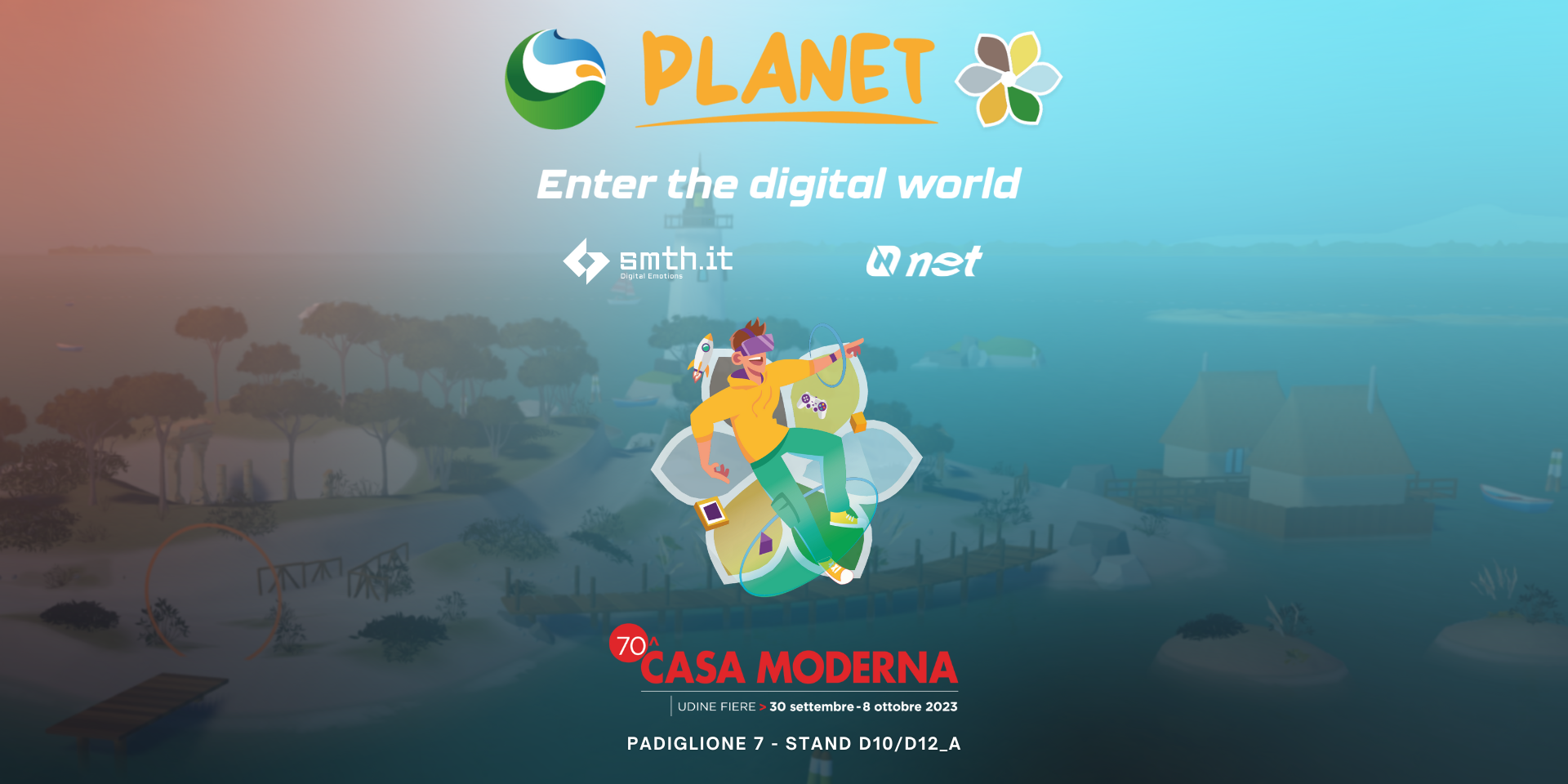 Per l’evento di Casa Moderna, Net ha voluto creare uno stand con un’offerta innovativa, realizzando un’esperienza immersiva con proiettori laser professionali e uno schermo di 9 metri avvolgente, dove i visitatori potranno esplorare “PlaNet” con l’avatar personalizzato presente nel metaspazio.