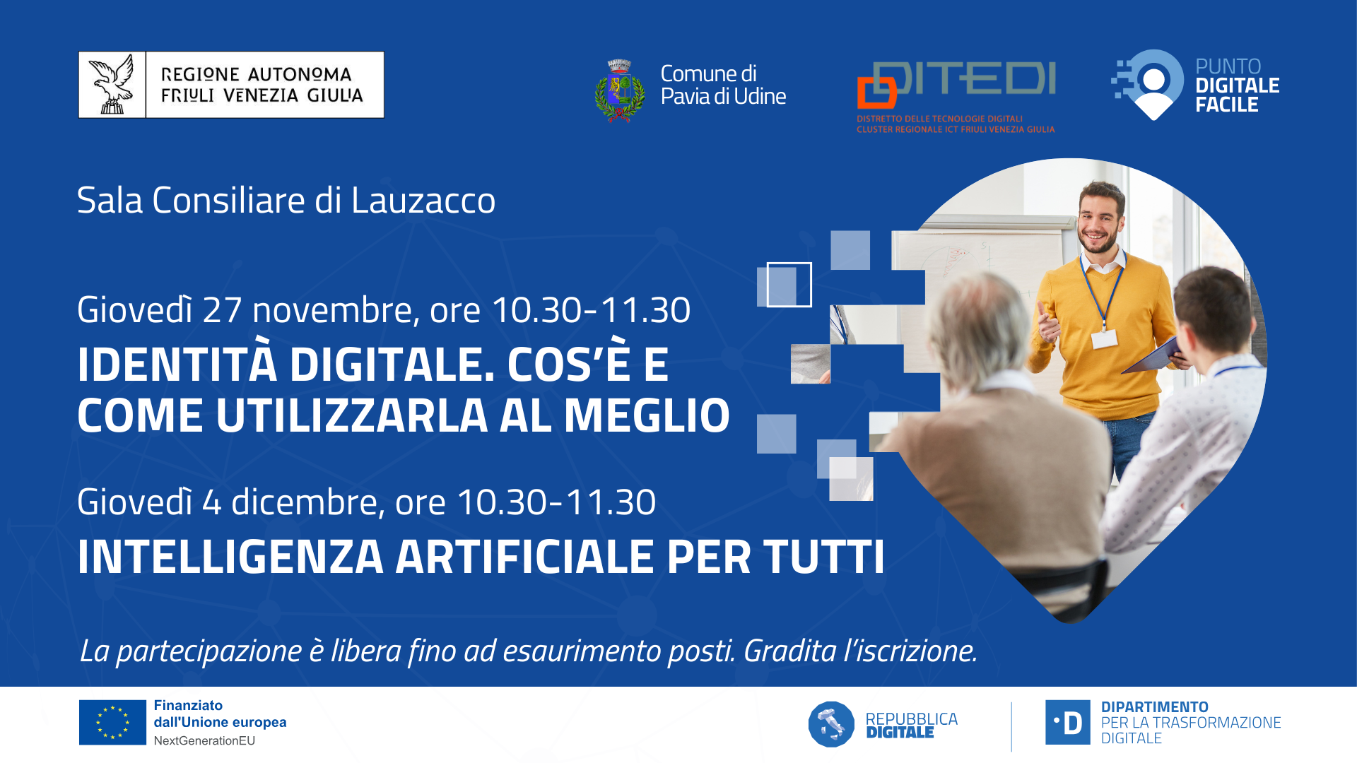 L’evento è organizzato dal Punto Digitale Facile del Comune di Pavia di Udine in collaborazione con DITEDI, nell’ambito del progetto “Rete dei servizi di facilitazione digitale” finanziato dall’Unione Europea NextGeneration EU con la Misura PNRR 1.7.2.