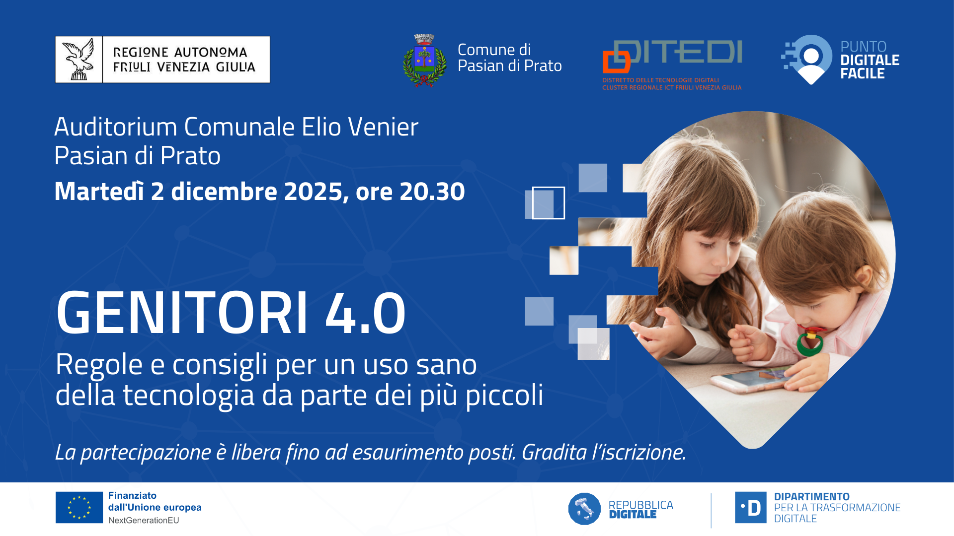 L’evento è organizzato dal Punto Digitale Facile del Comune di Pasian di Prato in collaborazione con DITEDI, nell’ambito del progetto “Rete dei servizi di facilitazione digitale” finanziato dall’Unione Europea NextGeneration EU con la Misura PNRR 1.7.2.