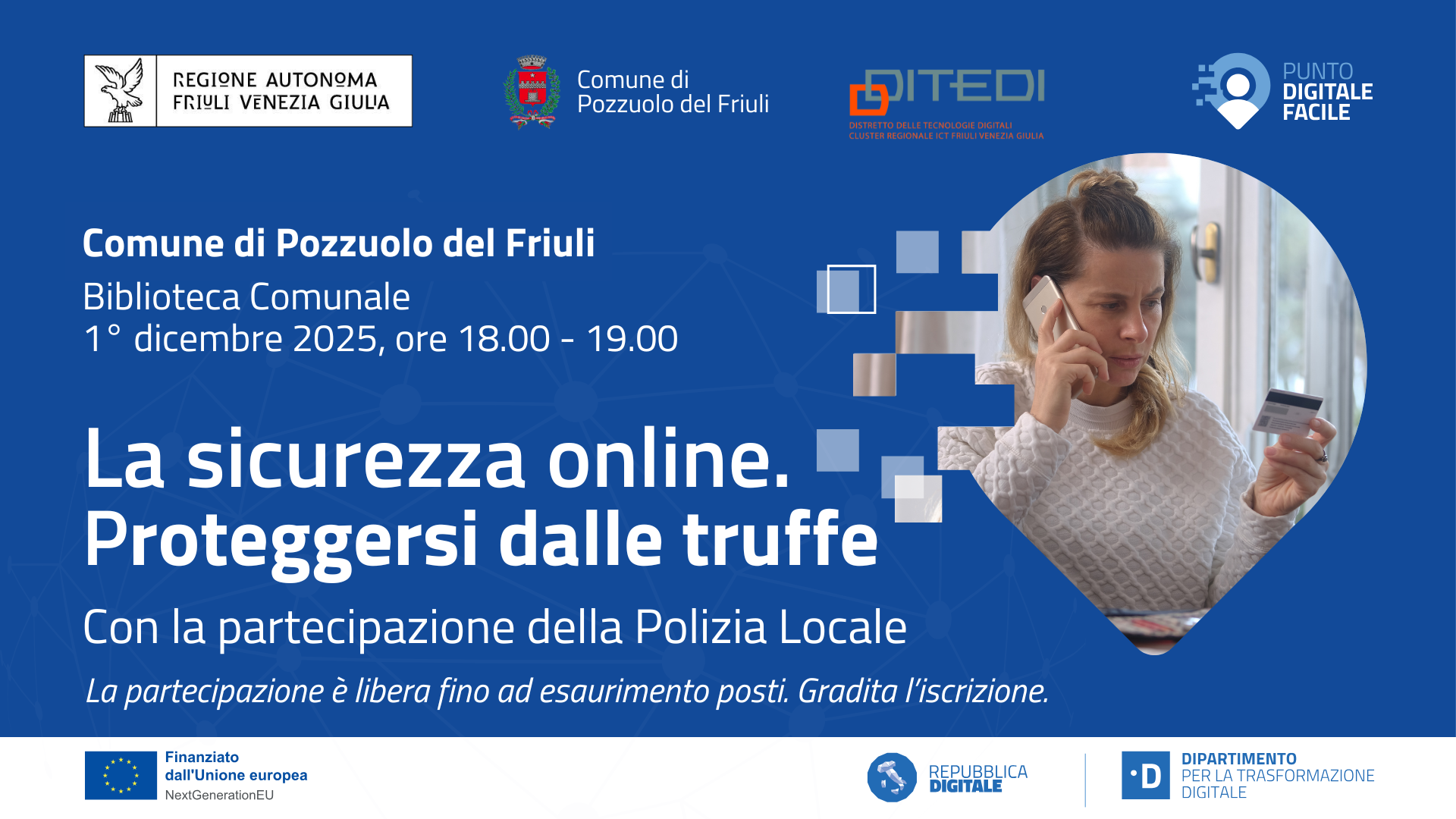L’evento è organizzato dal Punto Digitale Facile del Comune di Pozzuolo Del Friuli in collaborazione con DITEDI, nell’ambito del progetto “Rete dei servizi di facilitazione digitale” finanziato dall’Unione Europea NextGeneration EU con la Misura PNRR 1.7.2.