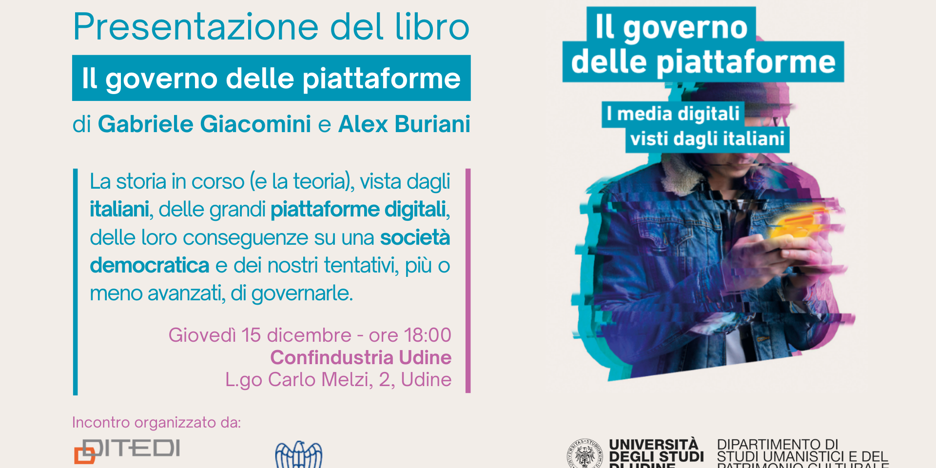 DITEDI, insieme a Confindustria Udine e al Dipartimento di Studi Umanistici e del Patrimonio Culturale dell’Università degli Studi di Udine, organizza per giovedì 15 dicembre alle 18:00 la presentazione del libro “Il governo delle piattaforme. I media digitali visti dagli italiani“, scritto da Gabriele Giacomini e Alex Buriani e pubblicato quest’anno da Meltemi Editore.