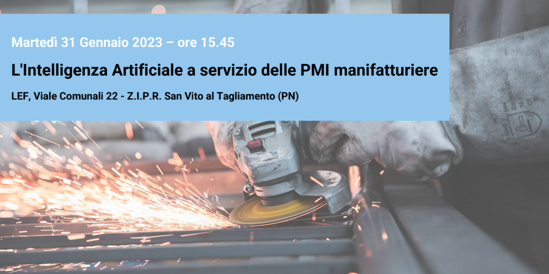 DITEDI segnala l’evento organizzato dal Cluster COMET insieme a IP4FVG e LEF: “L’Intelligenza Artificiale a servizio delle PMI manifatturiere”, che si terrà nella sede di LEF il 31 gennaio 2023 alle ore 15:45. L’incontro sarà un’opportunità per le PMI interessate all’intelligenza artificiale e a come questa può contribuire a innovare processi, prodotti e modelli di business all’interno dell’impresa.