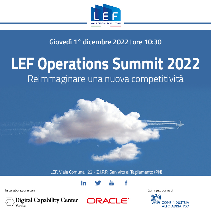 LEF Operations Summit sarà trasmesso in diretta streaming dall’azienda modello LEF, un luogo simbolo della trasformazione digitale italiana che da oltre dieci anni ha le sue radici nel Nord Est a San Vito al Tagliamento (PN).
