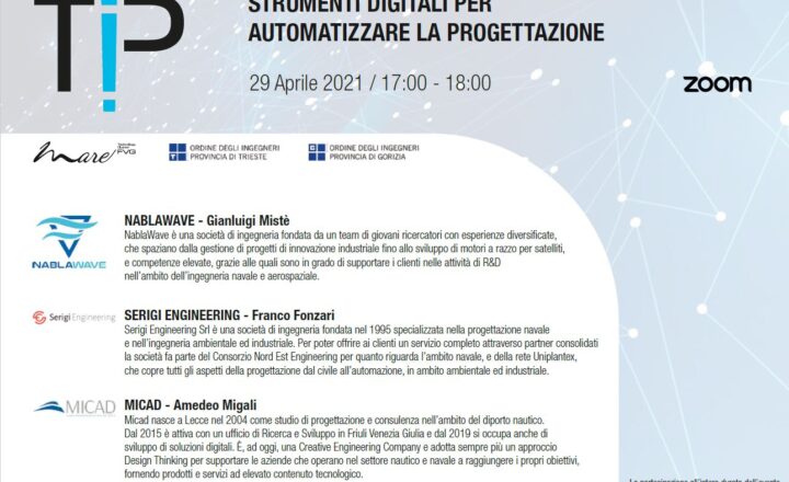 Si segnala che in data 29 aprile, alle ore 17.00, si terrà l’evento “TIP! Strumenti digitali per automatizzare la progettazione”.